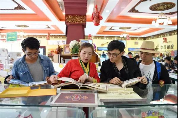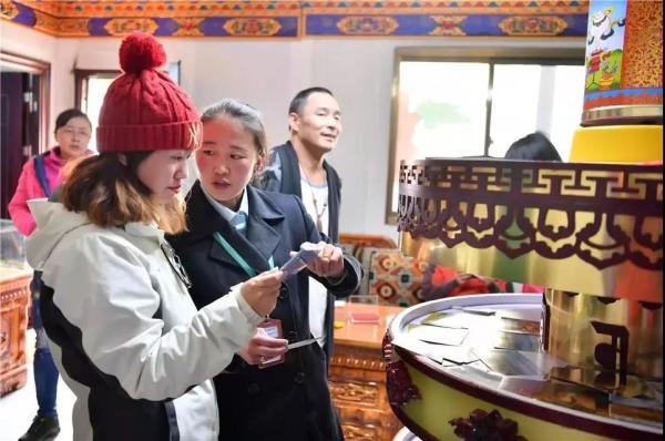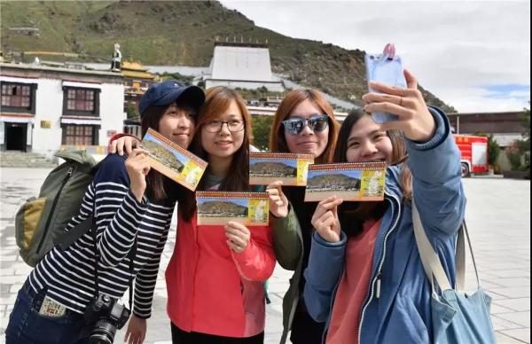 扎什伦布寺,来自香港的游客在展示中国邮政设计制作的景区门票。西藏邮政以深度融合西藏旅游文化、西藏民俗文化和邮政文化为核心,以邮政先进的网络、技术为支撑,服务景区,服务游客,融入西藏旅游发展热潮,助推西藏旅游经济的发展。