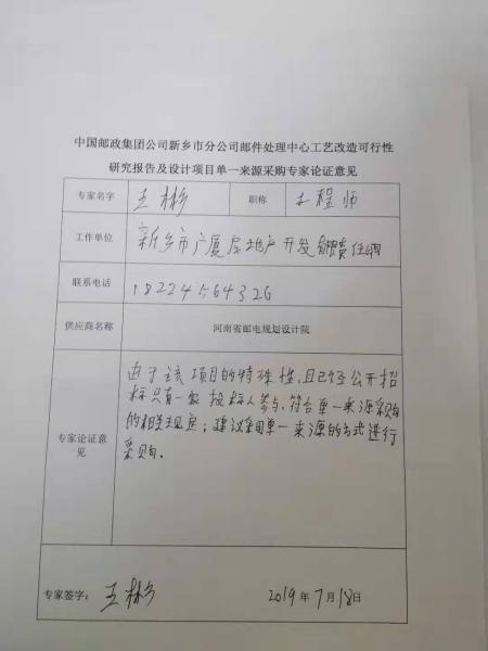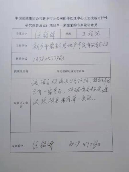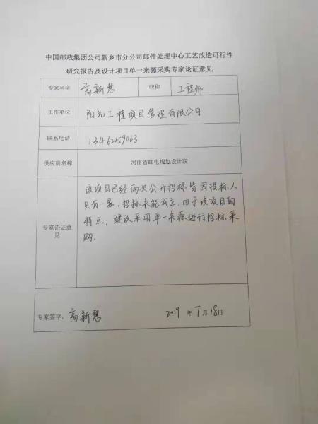 中国邮政集团公司新乡市分公司邮件处理中心工艺改造可行性研究报告及设计项目在《中国采购与招标网》、《河南招标采购综合网》、《中国招标投标公共服务平台》、《中国邮政集团公司河南省分公司网站》分别于:2019年6月25日发布第一次公开招标公告,在报名截止时间只有一家公司报名参与,于2019年7月3日招标失败公告;2019年7月10日发布该项目二次公开招标公告,截止报名时间只有一家投标单位参与。于2019年7月18日发布本项目的二次招标失败公告。本项目参与报名的供应商,即河南省邮电规划设计院,且该供应商符合本项目的资质条件。经专家论证,现拟对该项目单一来源采购