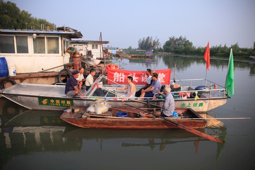 江苏省淮安市洪泽区老子山镇三面环水,300平方公里面积90%为滩涂水面。全镇1.8万居民中,六成左右是散居湖荡滩头、从事捞捕或养殖的渔民。篓,用绳子拴在腰上;娃,用绳子拴在船上;船,用绳子拴在岸上……渔民们常年过着“船底无刮子”的漂泊生活,内心都渴望一处温暖的港湾,危难时可以依靠,需要时获得帮助。他们因此习惯在船上挂一面国旗,作为湖上生活的精神寄托以及四季平安的护身符。“他是党派来的人。”在渔民们心中,唐真亚也是湖区的一面旗帜。
