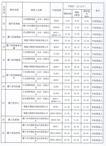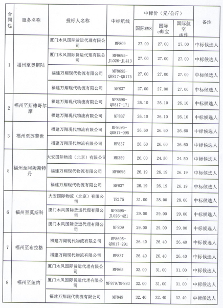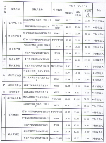 中国邮政集团公司福建省分公司就“2020年国际航空运能补充采购项目”(项目编号:CPFJ20190067)组织采购,评标工作已经结束,中标结果如下: