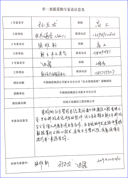 二、采用单一来源方式的原因及说明: 采购的红分管理系统是河南正旭通讯工程有限公司专为邮政系统开发的软件,该公司长期与中国邮政集团公司新乡市分公司深入开展多项业务合作,在系统的开发过程中掌握数据算法与核心技术,具有不可替代性。依照《中华人民共和国政府采购法》第31条的规定,现采用单一来源方式。