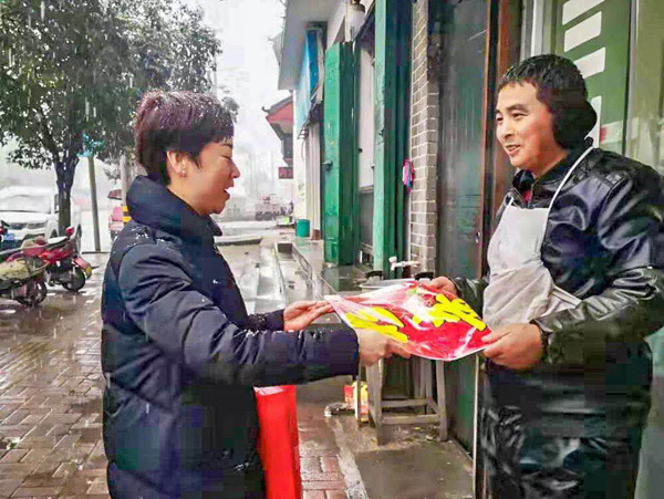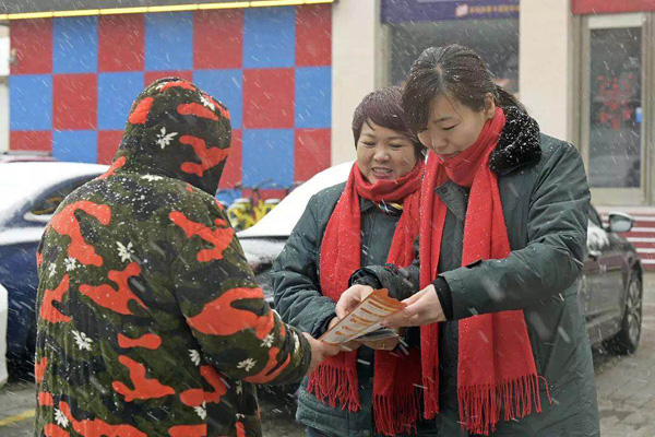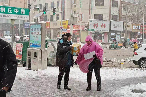 淮阳县新华大街支局员工顶风冒雪走访客户,宣传邮政好政策。