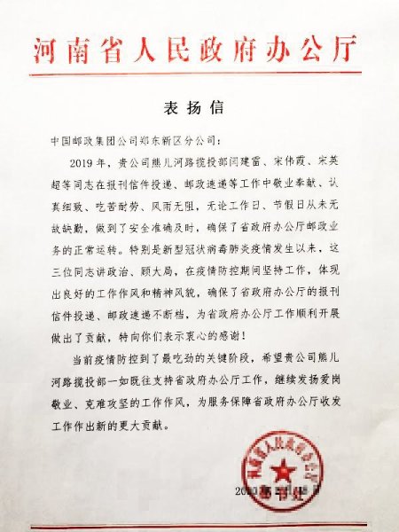 “新型冠状病毒肺炎疫情发生以来,熊儿河揽投部闫建雷、宋伟霞、宋英超三位同志讲政治、顾大局,在疫情防控期间坚持工作,体现出良好的工作作风和精神风貌,确保了省政府办公厅的报刊信件投递、邮政速递不断档,为省政府办公厅工作顺利开展做出了贡献,特向你们表示衷心的感谢!”2月19日,郑州市郑东新区邮政分公司收到了一封来自河南省人民政府办公厅的感谢信。