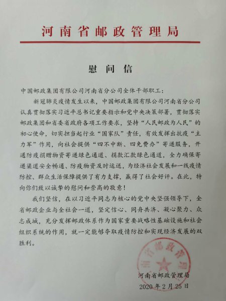 2月25日,河南省邮政管理局向省分公司发来慰问信。信中指出:“新冠肺炎疫情发生以来,中国邮政集团公司河南省分公司认真贯彻落实习近平总书记重要指示和党中央决策部署,贯彻落实邮政集团和省委省政府各项工作要求,坚持‘人民邮政为人民’的初心使命,切实担当起行业‘国家队’责任,有效发挥出抗疫‘主力军’作用,向社会提供‘四不中断、四免费办’寄递服务,开通防疫捐赠物资寄递绿色通道、捐款汇款绿色通道,全力确保寄递渠道安全畅通、防疫物资及时运送,为经济社会发展和一线疫情防控、群众生活保障提供了有力支撑,赢得了社会好评。在此,特向你们致以诚挚的慰问和崇高的敬意!”