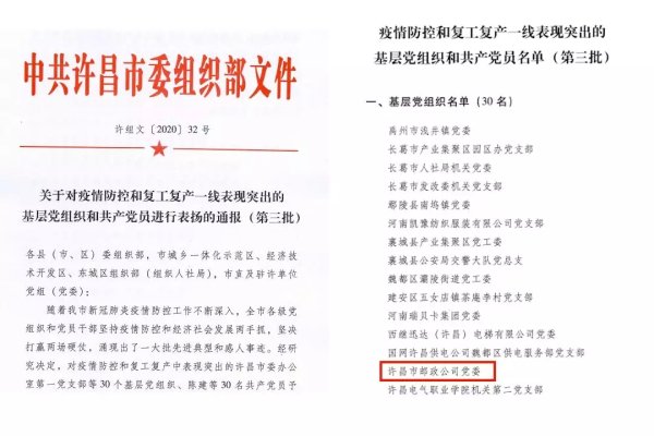 近日,许昌市委组织部印发通报,对在疫情防控和复工复产一线表现突出的许昌市邮政公司党委等30个基层党组织予以通报表扬。
