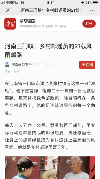 4月30日,中共中央宣传部“学习强国”平台以《河南三门峡:乡村邮递员的21载风雨邮路》为题,报道了渑池县邮政分公司张村支局乡邮员曹三年的故事,展现了河南邮政员工认真履行央企政治责任、社会责任,践行“人民邮政为人民”服务宗旨的风采。