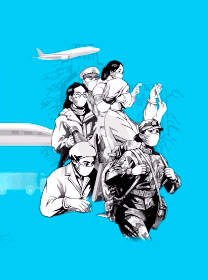 第一图,集中表现了解放军指战员、医护人员、科研工作者、社区工作者、人民警察、志愿者等群体形象,在远景中描绘了疾控人员进行流行病学调查、志愿者和快递小哥开展防疫和日常生活物资配送等场景,画面上方勾勒出城镇楼宇建筑和乡村景象,体现城市乡村人人参与防控,进一步突出了全民抗疫的主题。同时,图中还设计了飞机、轮船、货车、高铁等元素,展现全国各地包括海外驰援湖北、驰援武汉的感人场面。