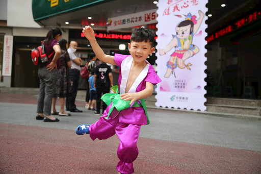 6月1日,重庆市沙坪坝区三峡广场邮政支局门前,前来购买《动画—葫芦兄弟》邮票的小朋友和家长络绎不绝,邮票上栩栩如生的葫芦兄弟形象吸引了小朋友的目光。三峡广场支局还特意为到场的小朋友准备了葫芦兄弟同款服装,供小朋友拍照留念。一位小朋友穿上葫芦兄弟服装后,在支局门前兴奋地手舞足蹈。 □朱亚坤 摄影报道