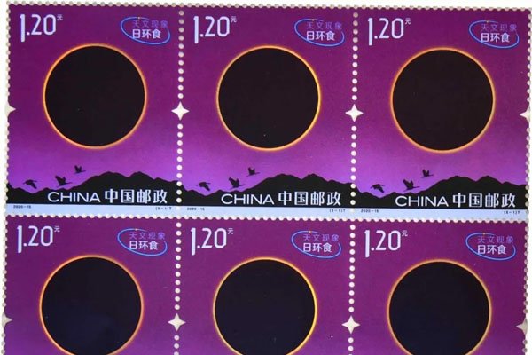 “日环食”邮票首次运用了高亮点工艺材料,极好地营造出了日环食边缘明亮、生辉的效果。