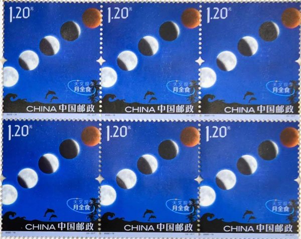 “月全食”邮票采用了夜光墨,使五个由缺至圆、不同亮度的月光效果表现得生动逼真。