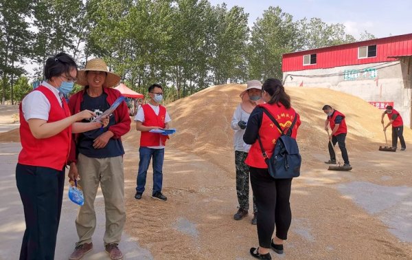 新乡市分公司市场营销部党支部开展“助力夏粮 我来帮忙”主题党日活动。图为机关党员正在走访卖粮户
