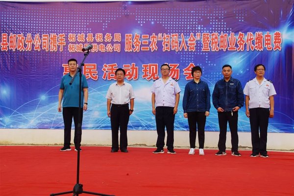 8月5日,柘城县邮政分公司联合县税务局、县供电公司在柘城县慈圣镇君臣村举行了“服务‘三农’‘扫码入会’暨税邮业务、代缴电费惠民活动现场会”,加快推进综合服务平台建设,促进协同共赢发展,更好的服务社会民生。