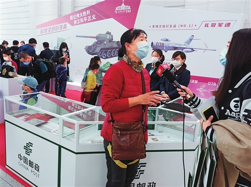 图为北京邮政在中国人民革命军事博物馆设立的临时邮局内,邮迷们积极选购邮品并接受媒体采访。
