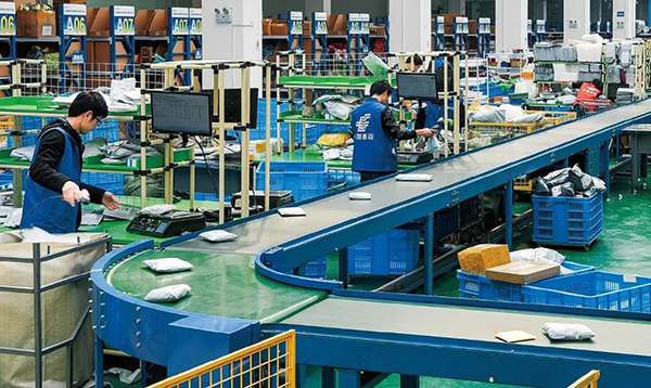 郑州邮政跨境电商产业园处理中心正在处理跨境电商邮件。