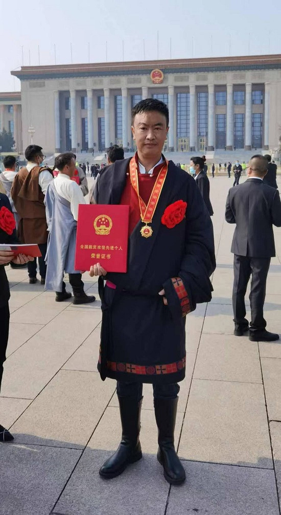 2月25日,全国脱贫攻坚总结表彰大会在北京人民大会堂隆重举行。大会上,中国邮政储蓄银行青海省分行班玛县支行行长、果洛州玛沁县下大武乡年扎村第一书记扎西闹吾荣获“全国脱贫攻坚先进个人”称号。