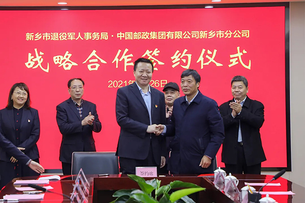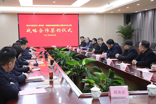 2月26日,新乡市邮政分公司与市退役军人事务局签署了退役军人服务战略合作协议,双方进一步强化合作,发挥邮政网络优势,为军人军属、退役军人和其他优抚对象提供优先、优质、优惠服务。
