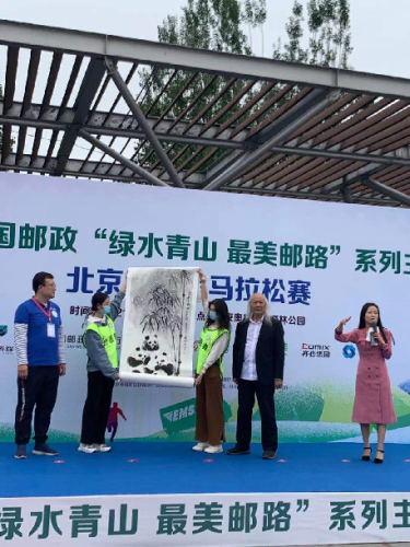 16日,2021年中国邮政“绿水青山最美邮路”系列主题赛北京站——“逐梦冬奥 相约北京”半程马拉松赛,暨“祝福冬奥”明信片首发式在北京奥林匹克森林公园举办。活动现场,“祝福冬奥”明信片原画作者杨竹向体育邮局捐赠画作。