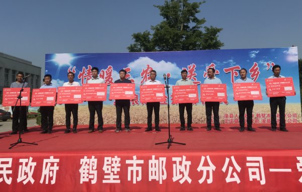 为关爱“三农”,助力夏粮收购,在浚县人民政府的大力支持下,鹤壁市邮政分公司携手中邮人寿保险股份有限公司河南分公司,向浚县1200余名收割机手每人捐赠8万元保额人身意外伤害险和2000元保额意外医疗险,总保额达1亿元。保险赠送仪式上,该分公司还向浚县王庄镇的收割机手代表们赠送了装有T恤、水杯、防晒帽的爱心大礼包。