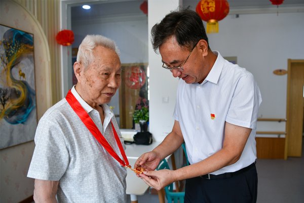6月23日,省分公司党委书记、总经理杜福一行,先后看望慰问了邮政离休老党员时国奇和颜光,将“光荣在党50年”纪念章戴在了他们的胸前,同时代表省分公司党委向全省邮政企业广大老党员老干部致以亲切问候和崇高敬意。