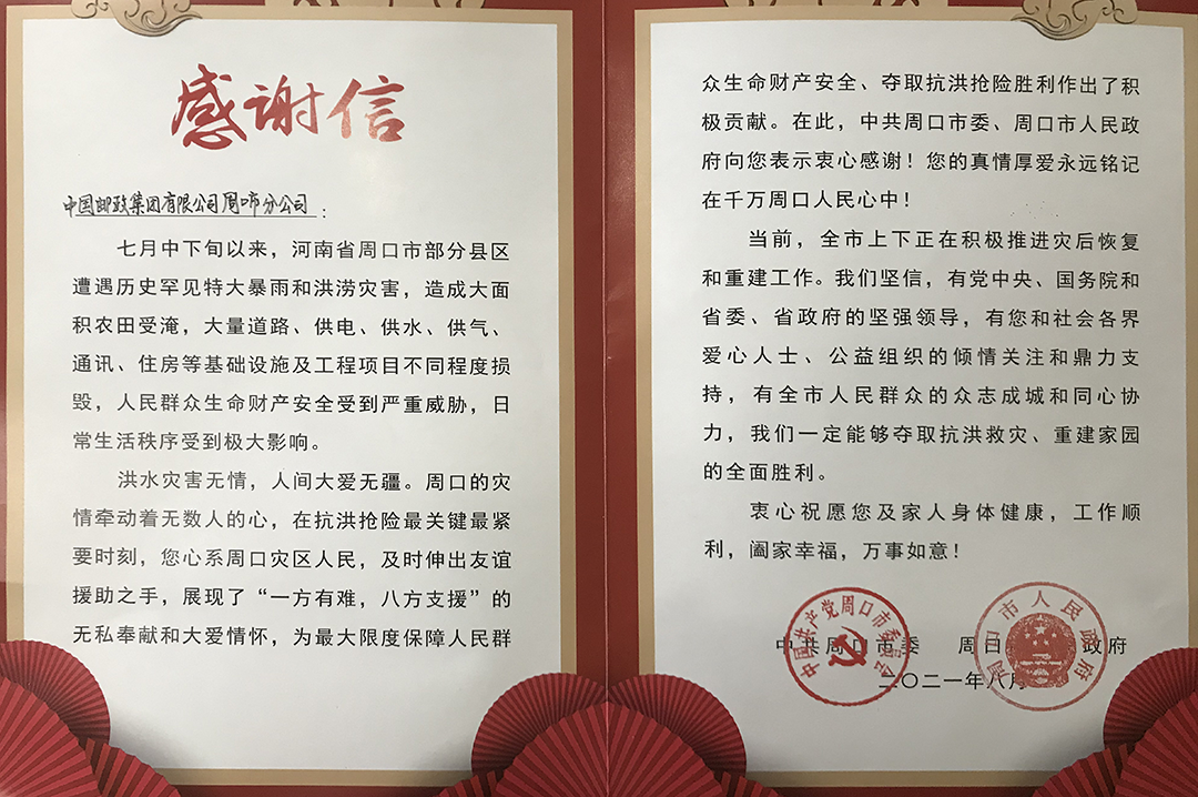 8月23日,周口市邮政分公司收到了市委市政府送来的感谢信,在信中,周口市委市政府称赞市邮政分公司为最大限度保障人民群众生命财产安全、夺取抗洪抢险胜利作出了积极贡献。