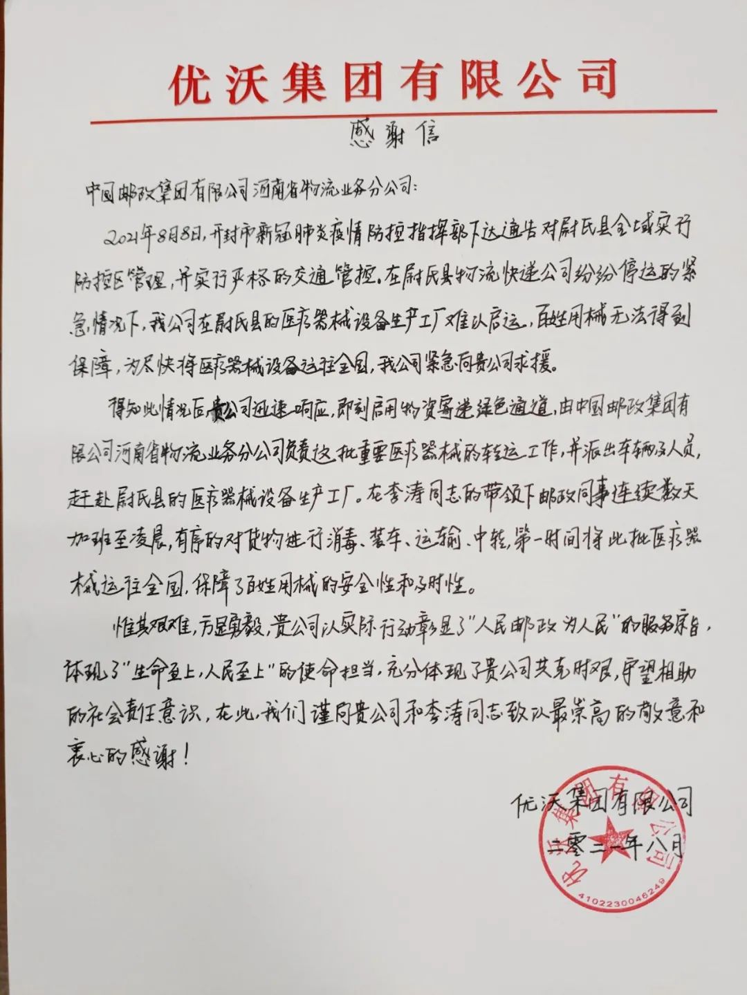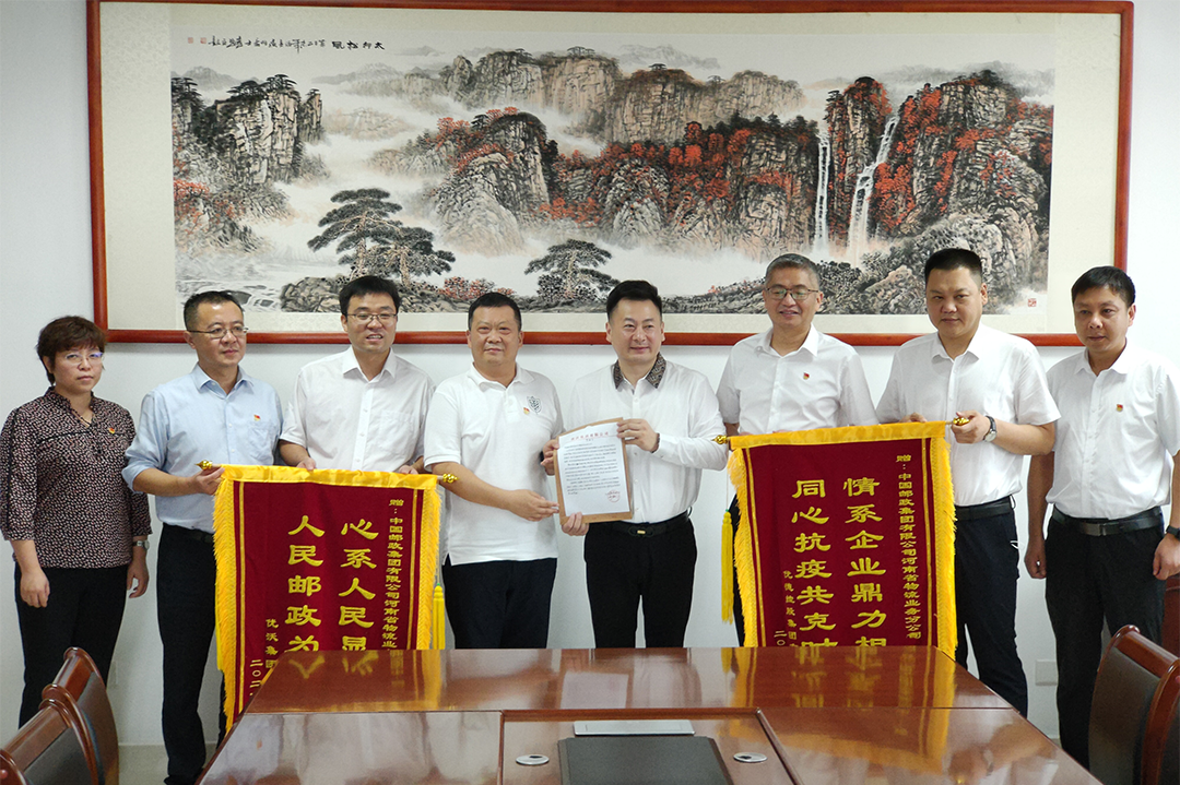 8月31日上午,河南优沃集团总裁张震、副总裁李占亚将一封感谢信和印有“心系人民显初心 人民邮政为人民”、“情系企业鼎力相助 同心抗疫共克时艰”的锦旗送到了河南邮政物流业务分公司,对河南邮政积极参与疫情防控,圆满完成医疗器械转运工作表示衷心感谢。