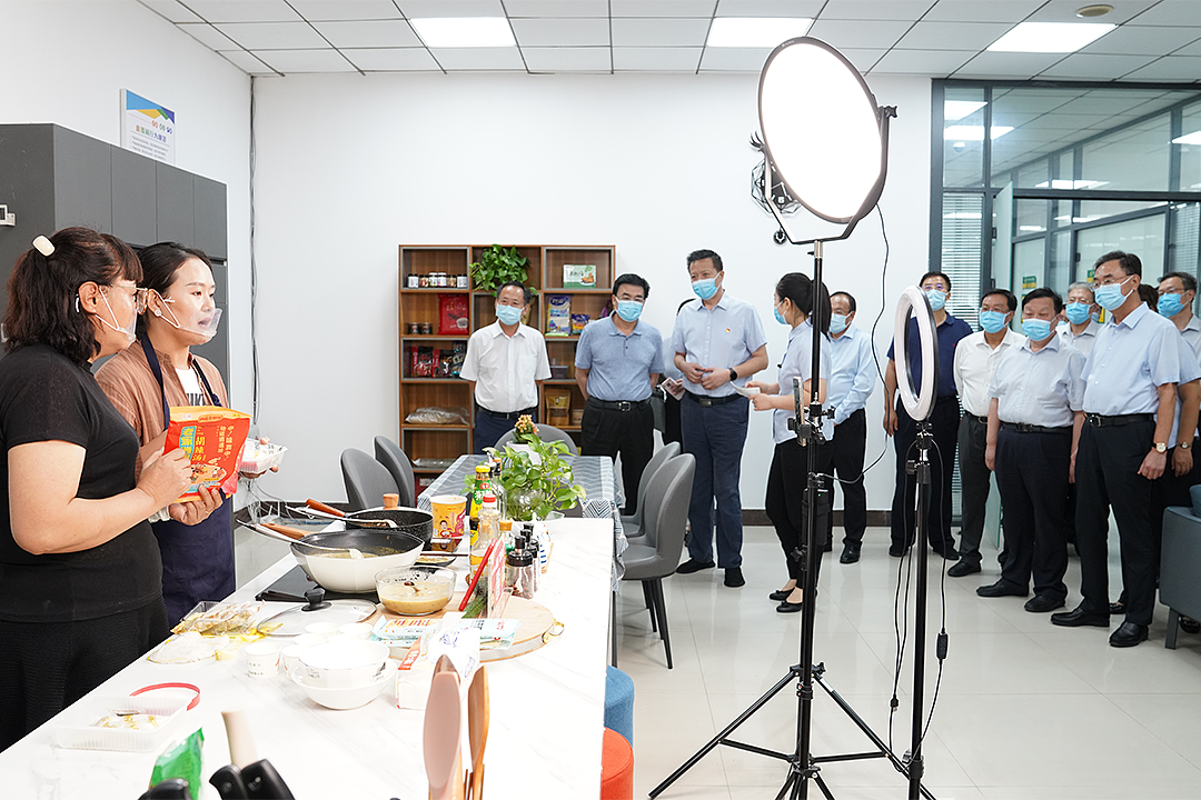 在新乡邮政电商直播区,“复工助农加速跑 自强邮爱新乡行”直播活动正在进行。一间间设备齐全、窗明几净的直播间内,邮政直播人员及入驻商户正在现场制作河南特色美食,热情与网友互动;直播间大屏幕上,累计观看人数、成交量和成交金额正在持续攀升。何金平一行兴致勃勃地观摩了现场直播,全面了解了新乡邮政推介地方农特产品及美食制作,更好地服务老百姓疫情防控居家生活的做法。何金平表示,通过直播活动让农品从源产地直达居民餐桌,打造本地消费品牌,这种做法很好,希望邮政部门继续为河南农品“代言”。