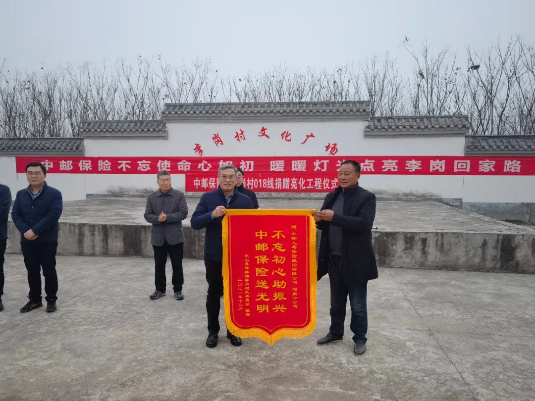 在活动第一站砖桥镇李岗村,参与乡村振兴帮扶活动的党员参加了邮政捐建的照明路灯亮灯仪式。活动现场,李岗村村支书王万青把锦旗赠送给中邮保险河南分公司。