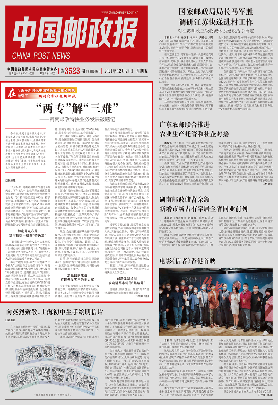 近日,中国邮政报以《“两专”解“三难”——河南邮政特快业务发展破题记》为题,在头版头条对河南邮政持续推进寄递“两专”建设进行了报道。