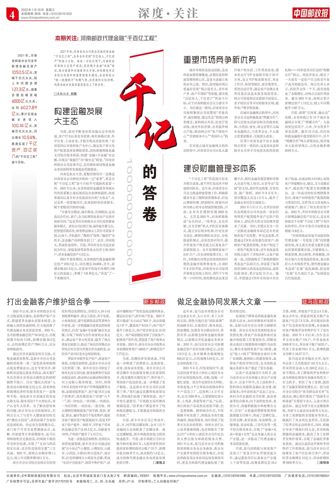 1月19日,《中国邮政报》以《千亿的答卷》为题,对河南省分公司金融业务发展取得的优异成绩进行了整版报道。