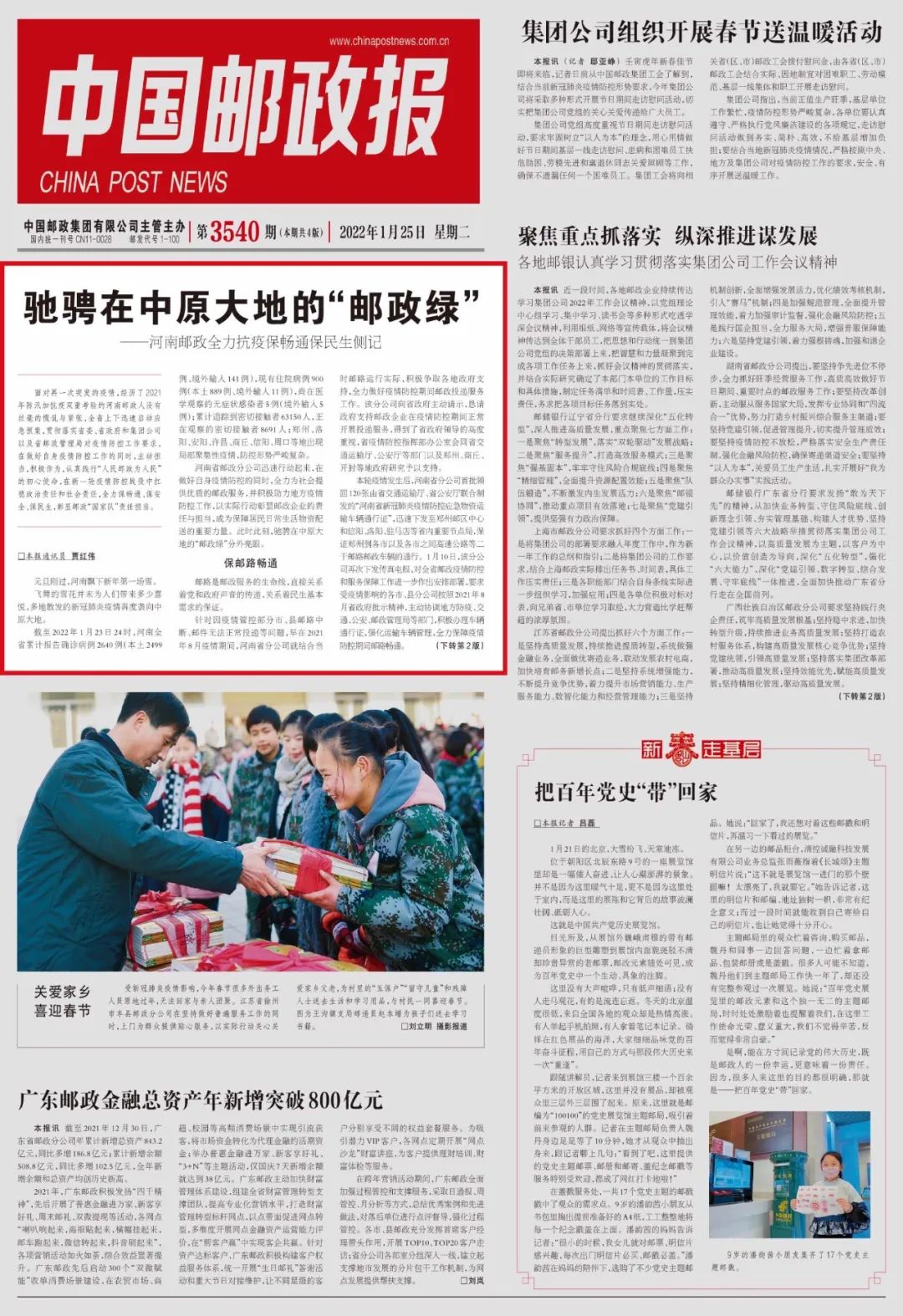 1月25日,《中国邮政报》在头版头条刊发了《驰骋在中原大地的“邮政绿”——河南邮政全力抗疫保畅通保民生侧记》的报道。