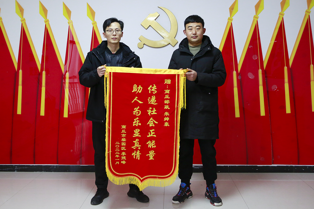 商丘市分公司还收到了被救老人家属送来的锦旗,锦旗上书写的“传递社会正能量,助人为乐见真情”,表达了老人对朱绅豪(上图左)最诚挚的感谢。
