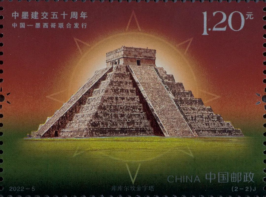 《中墨建交五十周年》纪念邮票图案分别为“观星台”和“库库尔坎金字塔”,第1图“观星台”邮票文字采用特亮银墨工艺,背景光晕和星星使用无色白荧光突出夜景效果,同时使用星星形异形齿孔;第2图“库库尔坎金字塔”邮票文字采用特亮金墨工艺,背景光芒使用无色橘荧光,突出太阳光芒四射的效果,同时使用太阳形异形齿孔。