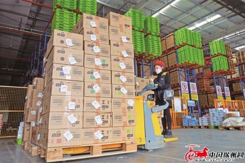 贾汪区普洛斯双楼物流园内库派同程仓库生活物资备货充足,工作人员正在进行物资配送。 本报记者 刘冰 摄