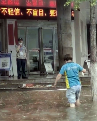 7月5日,夏邑遭遇暴雨侵袭后,市区道路积水,进入“看海”模式,但绿色邮车依然在大街小巷穿梭,揽投员们马不停蹄地揽收、投递邮件。