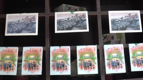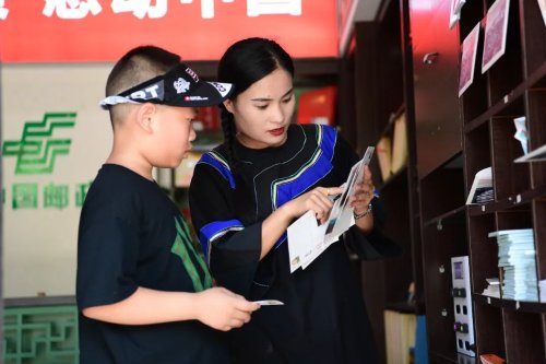 60平方米的主题邮局,摆放着各类主题邮品,游客的增多,让负责人麻秀珍有点忙不过来了。“现在是暑期,很多学生和小朋友都会来这里参观游玩,我会主动给他们介绍明信片和邮品上关于十八洞村的故事,很多人都对这些感兴趣,会买一份纪念邮品带回去给自己的同学、朋友,很有纪念意义。”她说。一位小朋友站在柜台前对比了几款明信片后,选择了一套《苗乡十八洞》的明信片,还让麻秀珍给他的每一张明信片都盖上邮戳。