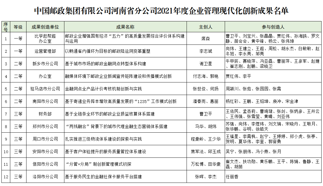 根据中国邮政集团公司河南省分公司、中国邮政集团工会河南省委员会《关于在全省邮政企业开展全员创新活动的通知》(豫邮分联〔2016〕6号)和《关于组织申报2021年度全省邮政企业管理现代化创新成果的通知》(豫邮分办传〔2022〕2号)相关要求,省邮政企协组织了2021年度企业管理现代化创新成果评审工作,共评出12项成果。公示期间如有异议,可通过信函、电话、电子邮件等方式向省邮政企协反映。