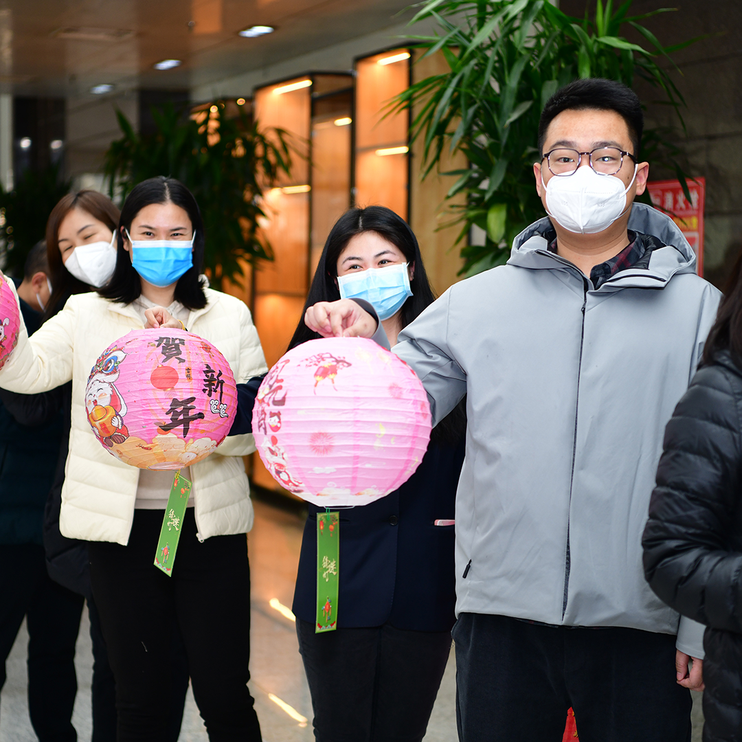 安阳市邮政分公司办公楼院内张灯结彩,干部职工一起赏花灯、猜灯谜、品汤圆,一派喜庆氛围。
