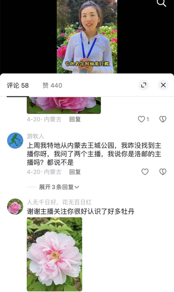 “喂!你是小雨吗?”闻声望去,洛阳邮政主播谢雨看到一位女游客一边快步向她走来,一边招手。这位女游客姓刘,她在看了“洛邮之旅”抖音直播后,4月5日专程从家乡新疆乘机赶到了洛阳观赏牡丹,恰巧遇到了正在录制视频的洛阳邮政直播团队。