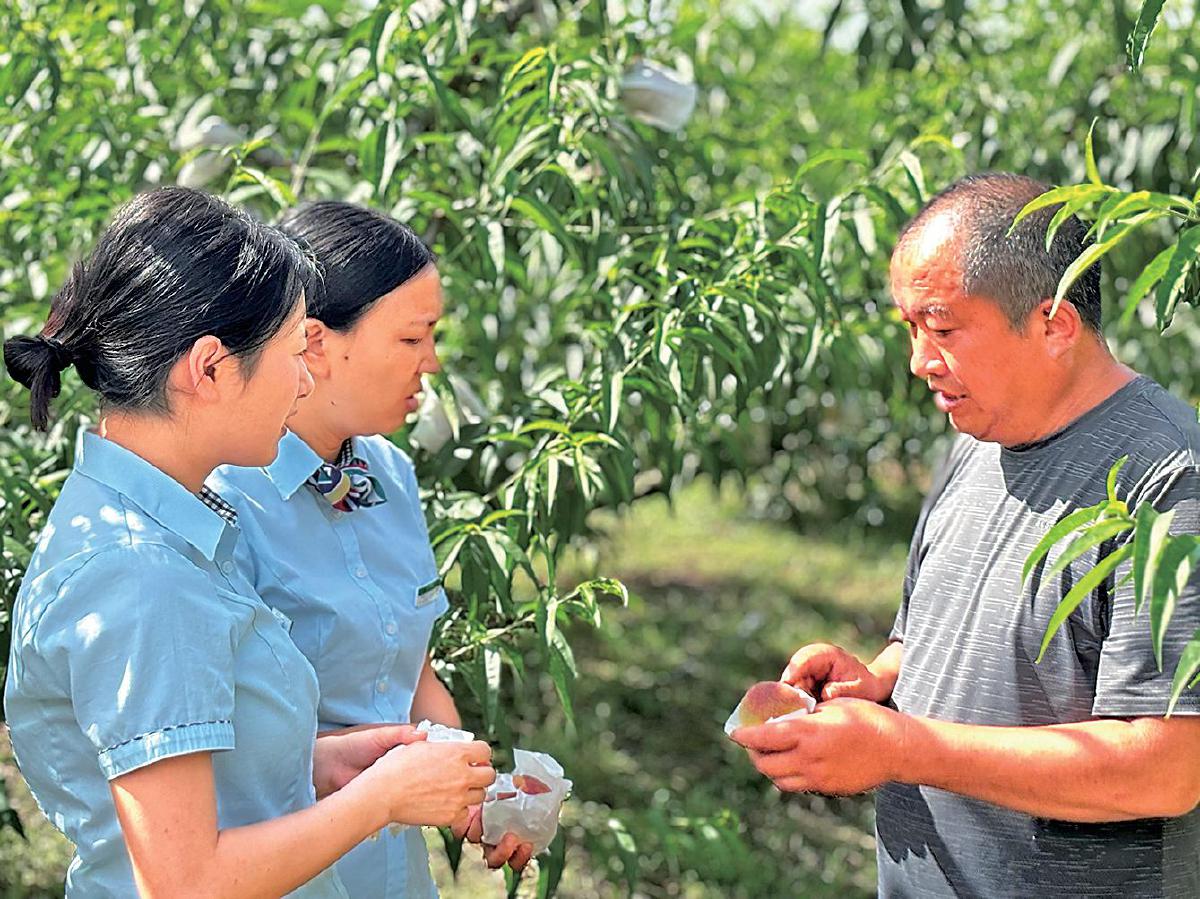 邮政工作人员在郭家村果园了解农品情况,并向农户介绍邮乐平台。 □宋贞颖 摄