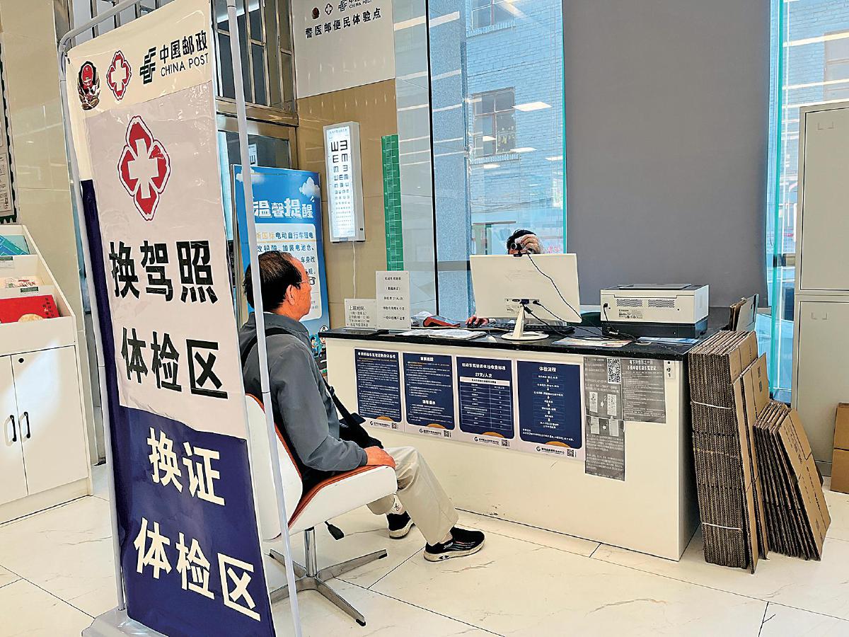 在昆明市吴井路邮政支局,工作人员为办理机动车驾驶证换证业务的客户进行体检。