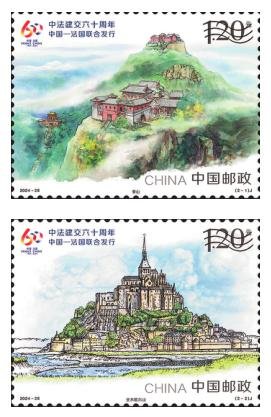 10月18日,《中法建交六十周年》(与法国联合发行)纪念邮票发行。该套邮票一套2枚,邮票图案名称分别为“1.泰山”和“2.圣米歇尔山”。