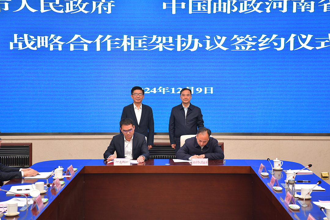 12月9日,郑州市人民政府与中国邮政集团有限公司河南省分公司签署战略合作框架协议。郑州市委副书记、市长何雄,河南省邮政分公司党委书记、总经理熊勇武出席签约仪式并举行工作会谈,就深化务实合作充分沟通交流。郑州市副市长马志峰、秘书长王春晓,省邮政分公司党委委员、副总经理夏策敏,郑州市分公司党委书记、总经理张世俊,以及双方有关部门负责人参加仪式。马志峰副市长、夏策敏副总经理代表双方签约。
