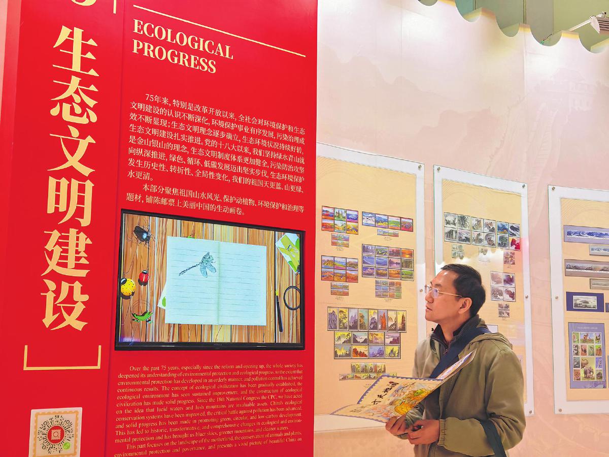 在庆祝中华人民共和国成立75周年邮票展上,新颖的电子展示方便观众观展。