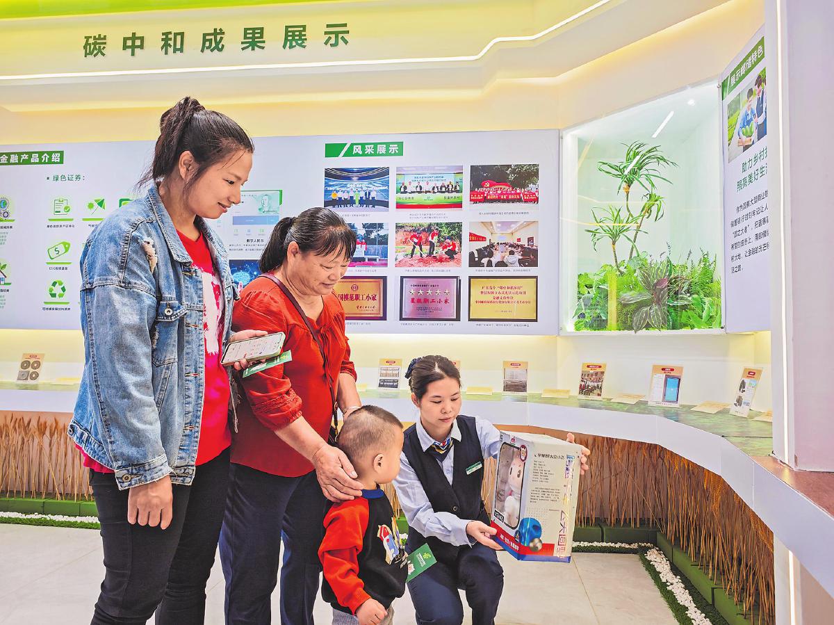 “少开一公里汽车,就减少0.22kg的碳排放量;省一度电,就减少0.638kg的碳排放量;少丢1kg垃圾,就减少2.06kg的碳排放量……”这些与个人低碳生活密切相关的科普知识点,被醒目地安排在展厅第一块展板上。之后,国家“双碳”(碳达峰、碳中和)目标政策、高州市的资源禀赋、邮储银行绿色金融产品介绍等展板直观生动地宣传着各类绿色环保知识。更特别的是,碳中和支行还用一组图片梳理了从贝壳到铸币再到纸币,最后到数字人民币的货币演变过程。展台特意设计得比较低,小朋友参观时可以隔着玻璃平视看到图片和模具。参观者的留言区,更是给展厅增添了互动功能。