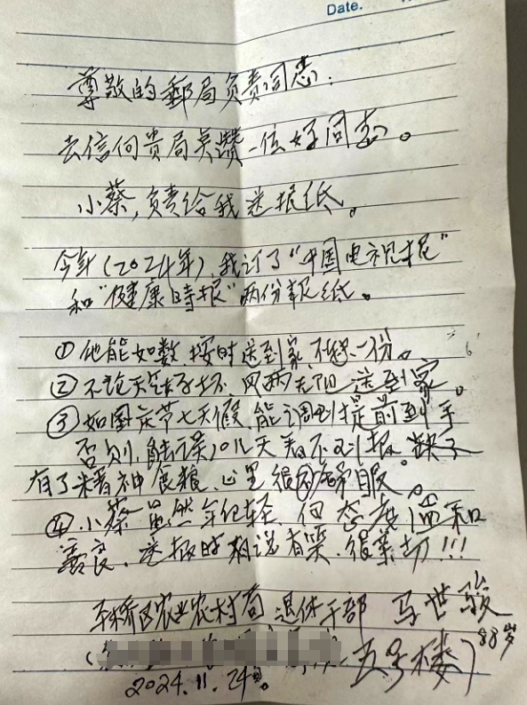 信阳邮政还收到了88岁的马世骏老先生写给平桥区揽投部投递员蔡旺的表扬信。在信中,马老说他订阅了《中国电视报》和《健康时报》两份报纸,蔡旺不仅按时送达每一份报纸,国庆假期也坚持派送,让他深受感动。