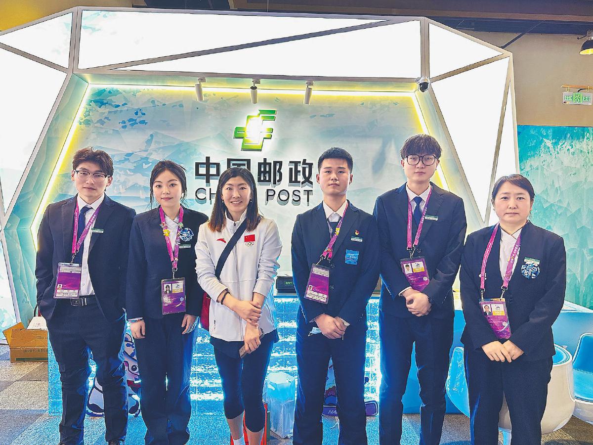 中国雪上项目首位全满贯获得者、本届亚冬会自由式滑雪女子空中技巧项目冠军徐梦桃(左三)在雅旺斯主题邮局邮寄包裹后,与邮政员工合影留念。□倪世雄 摄