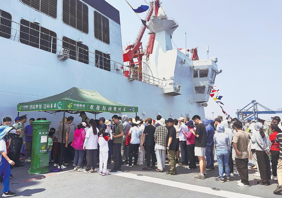 在人民海军成立76周年之际,入列4年的海南舰回到“家乡”,于海南省澄迈县马村散货码头稳稳靠港。4月24日至26日,海南舰面向公众开放。澄迈县邮政分公司抓住机遇,积极开展双拥共建工作,主动参与舰艇开放日活动,宣传海军建设成就。