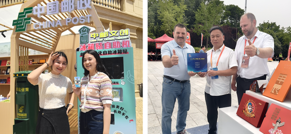 为满足参展客商和广大市民的用邮需求,漯河市邮政分公司在食博会现场和西城区分会场分别设立了邮政驿站,提供邮寄服务和邮政文创产品制作打卡。广大市民可现场体验“城市展览馆”“河上街”“贾湖遗址”“小商桥”“许慎文化园”“博物馆”等封片章戳及个性化冰箱贴制作,共享“食全食美漯在其中”的美好时光。该分公司还在邮票发行式会场外设置了邮票设计家签售处,吸引众多客商、集邮爱好者排起长队,争相购买食博会题材邮票。