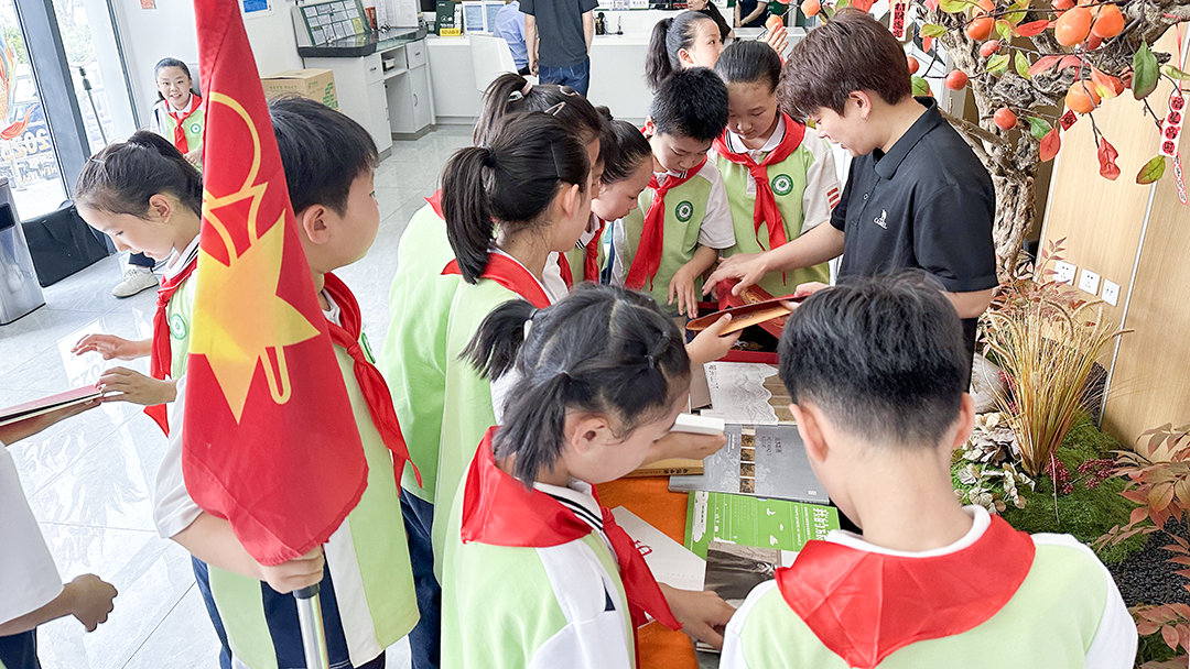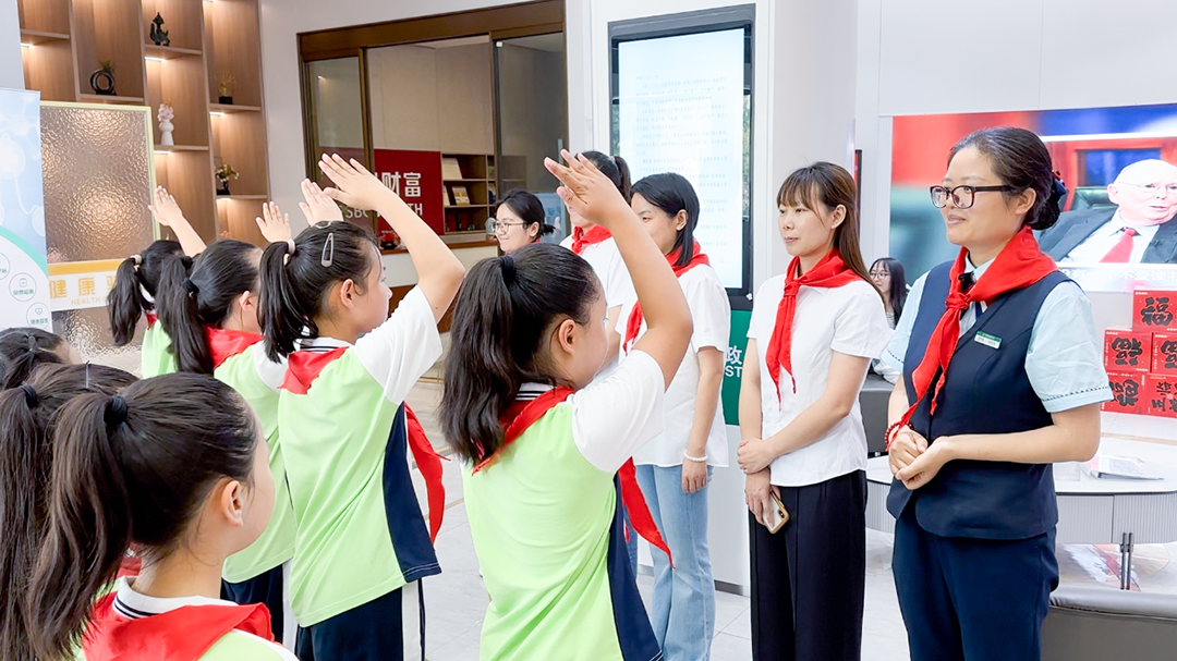 活动开始前,少先队员代表为支局邮政工作人员佩戴了红领巾,崭新的红旗一角映红了营业大厅。随后,工作人员带领少先队员来到金融功能专区,为大家讲解了邮政普惠金融知识,向孩子们讲述了邮政发挥协同优势,解决农户融资难题,服务乡村振兴的故事。