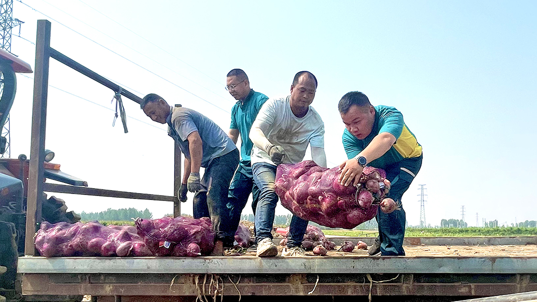 千亩洋葱田里,红粉相间的葱球在阳光下熠熠生辉,50名身着绿衣的邮政员工和菜农们一道挖葱、分拣、称重、包装……他们忙碌的身影与满载的邮车交织成一幅生动的丰收图。